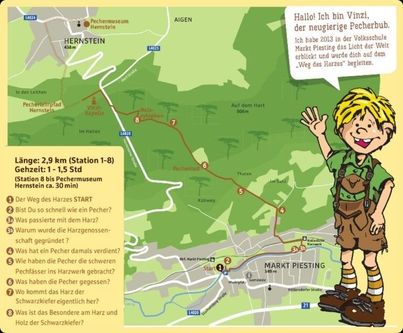 Weg des Harzes – über 8 informative Stationen führt die knapp drei Kilometer lange Strecke von Markt Piesting (großer Parkplatz), am Gelände des ehemaligen Harzwerkes vorbei, durch den duftenden Föhrenwald, leicht bergauf bis zum Start des Pecherlehrpfades Hernstein.