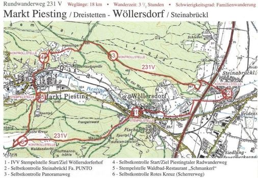 231 V – ein erst kurz bestehender Rundwanderweg, der die Gemeindegebiete von Markt Piesting – Dreistetten mit dem von Wöllersdorf – Steinabrückl verbindet. Die Streckenlänge dieses Weges beträgt ca. 18 Kilometer, die Gehzeit wird mit 3 ½ Stunden angegeben.